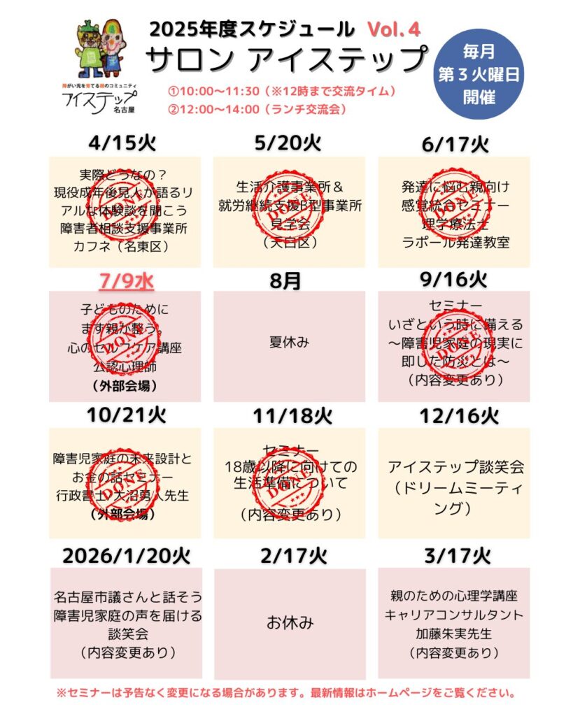 2025年度 アイステップのセミナー・座談会などの開催スケジュールです。※開催内容や日程は予告なく変更する場合があります。セミナーについてのお知らせは、LINE公式アカウントにていち早く情報をお知らせします。